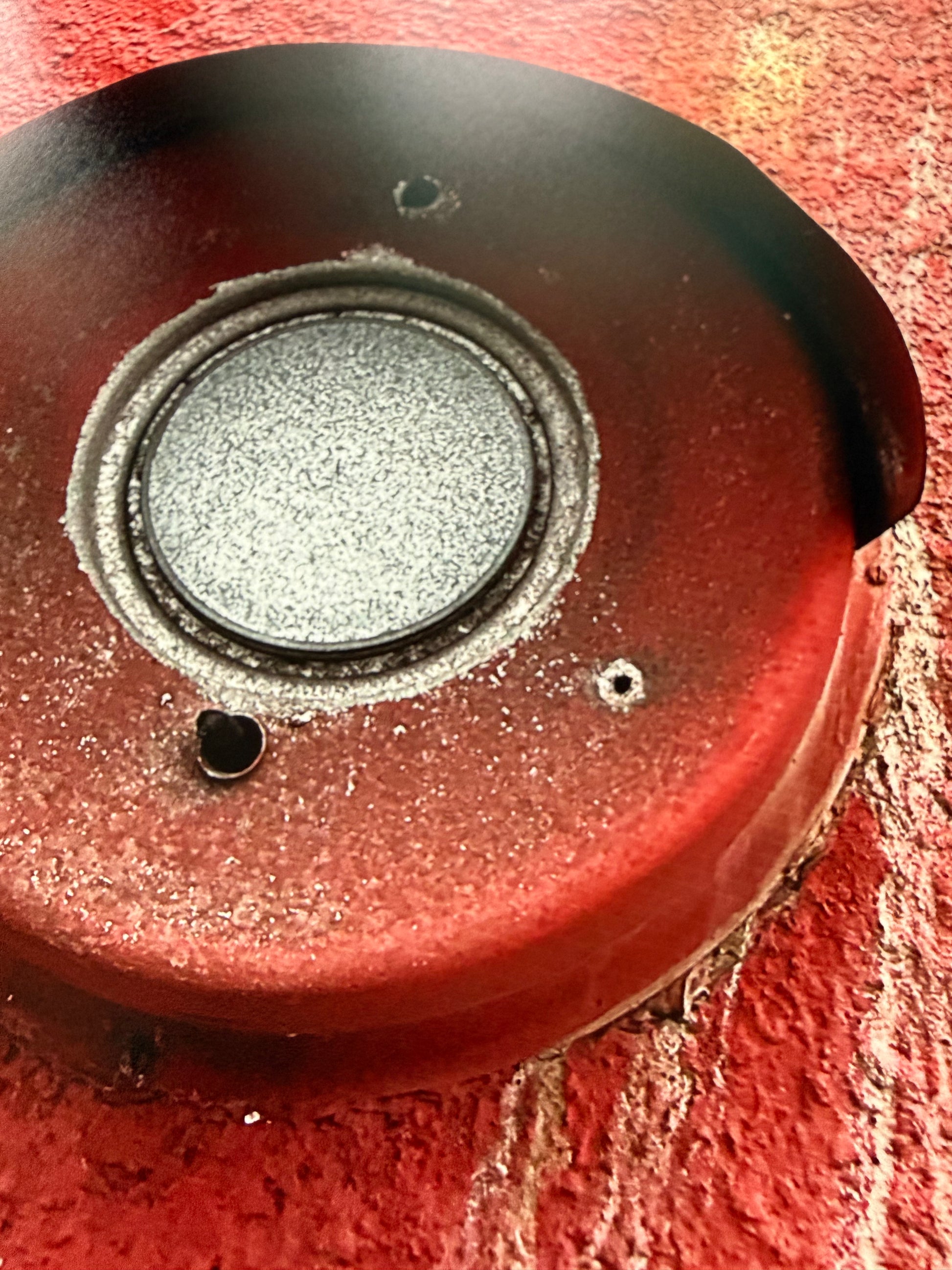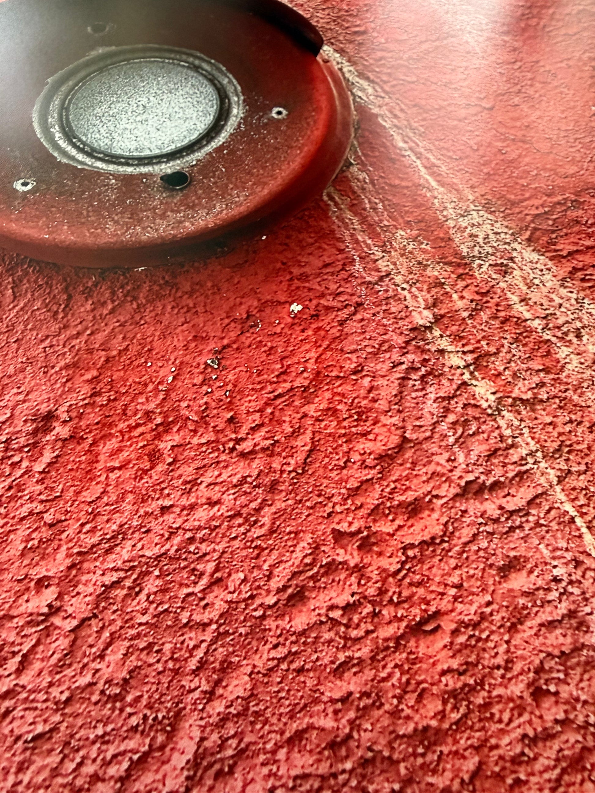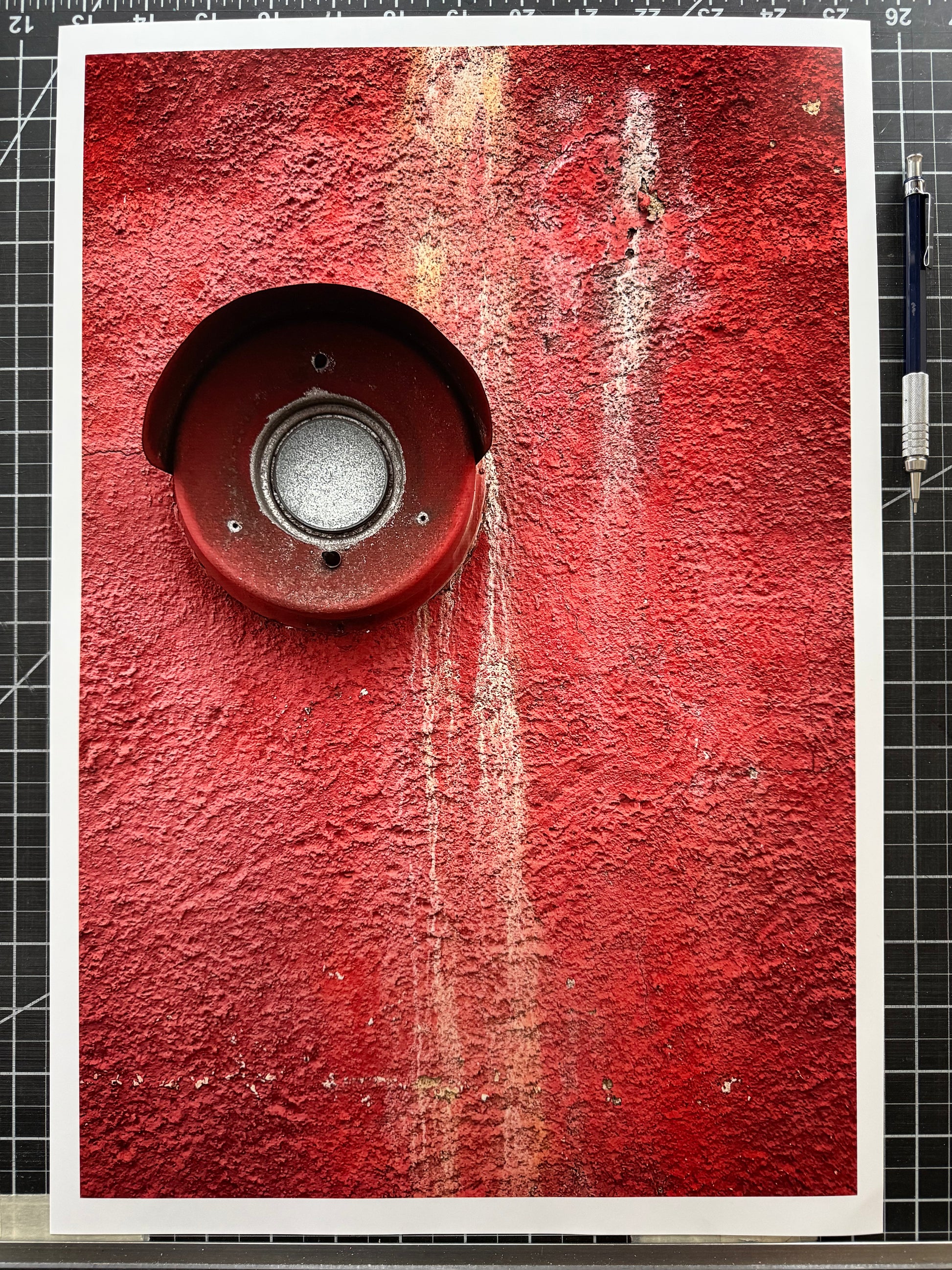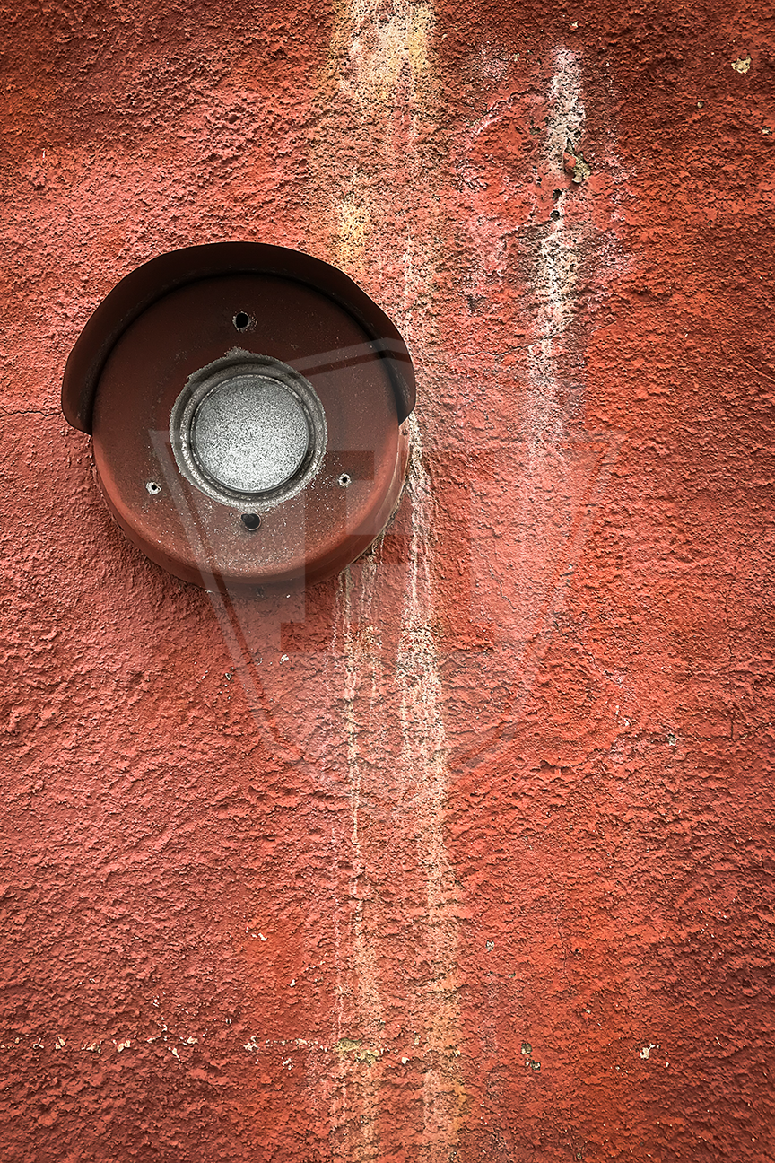 "This broken light fixture stood out to me while I was stopped at a red light. It looked a bit like a porthole or traffic light, and the gritty texture of the wall and stains drew my eye."